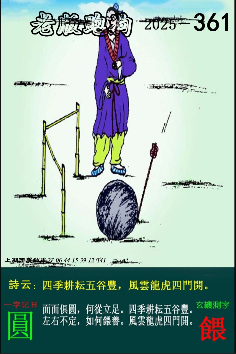 361期老版跑狗一字記之曰:【圓】 詩雲:四季耕耘五谷豐,風雲龍虎四門開。 面面俱圓,何從立足。四季耕耘五谷豐! 左右不定,如何餵養。風雲龍虎四門開。 玄機測字:《餵》 解:四季耕耘五谷豐,吉美:兔龙蛇马羊鸡 ============================ 360期老版跑狗一字記之曰:【鄉】 詩雲:那勝妃子朝元閣,玉手和煙弄壹枝。 背景離鄉,來到城市。那勝妃子朝元閣! 孤身流浪,沒權沒勢。玉手和煙弄壹枝。 玄機測字:《槿》 解:孤身流浪,独字生肖:鼠牛虎兔马羊 ============================ 358期老版跑狗一字記之曰:【匪】 詩雲:東風不費舟船力,紅顔兩鬢何青青。 得之壹元,匪受自天。東風不費舟船力! 太老之真,無上之仙。紅顏兩鬢何青青。 玄機測字:《無》 解:得之壹元,匪受自天,天肖:兔马猴猪牛龙 ============================ 355期老版跑狗一字記之曰:【瘦】 詩雲:四處碰壁好凄凉,不肯低頭有商量。 人窮誌短,馬瘦毛長。四處碰壁好凄凉! 憤世嫉俗,有福難享。不肯低頭有商量。 玄機測字:《頭》 解:憤世嫉俗,有福難享,凶丑:鼠牛虎猴狗猪。 ============================ 352期老版跑狗一字記之曰:【點】 詩雲:甘露清晨五野綠,雨過天晴四七發。 點點心思,只求得飽。甘露清晨五野綠! 壹路風塵,三餐不繼。雨過天晴四七發。 玄機測字:《塵》 解:點點心思,只求得飽,贫苦生肖,牛马猴鸡狗鼠 ============================ 351期老版跑狗一字記之曰:【閑】 詩雲:滿腹詩書十余載,出門不識桃李樹。 旅楹有閑,人神允葉。滿腹詩書十余載! 滿腹詩書十余載,出門不識桃李樹。 玄機測字:《識》 解:福以德昭,五福生肖:鼠虎兔龙蛇猴 ============================ 349期老版跑狗一字記之曰:【祜】 詩雲:刷愎自用太狂妄,戴石心服魋磨化! 嗟余薄祜,少遭不造。鄙愎自用太狂妄! 哀茕靡奭,越在襁褓。戴石心阳魋磨化 玄機測字:《襁》 解:鄙愎自用太狂妄,凶丑:鼠牛虎猴狗猪 ============================ 348期老版跑狗一字記之曰:【喫】 詩雲:夕陽猶在小橋西,觀音院僧謀寶貝! 不知進退,必喫苦頭。夕陽猶在小橋西! 自怨自艾,不如自救。觀音院僧謀實貝 玄機測字:《怨》 解:夕陽猶在小橋西,阳性:牛虎兔羊猴鸡 ============================ |