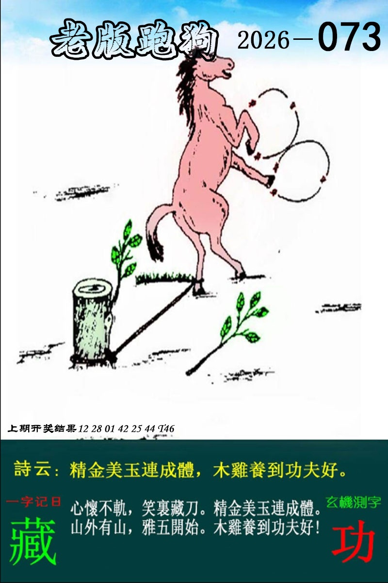 074期老版跑狗一字記之曰:【輸】 詩雲: 教飛無非爲捉蟲,好食難飛成何用。贏在起跑,輸在衝綫。教飛無非爲捉蟲。勝負難測,沒法推算。好食難飛成何用。玄機測字:《測》 解:好食難飛成何用,凶丑:鼠牛虎猴狗猪。 ============================ 073期老版跑狗一字記之曰:【藏】 詩雲: 精金美玉連成體,木雞養到功夫好。心懷不軌,笑裹藏刀。精金美玉連成體。山外有山,雅五開始。木雞養到功夫好!玄機測字:《功》 解:山外有山,山肖:鼠虎兔羊猴鸡猪。 ============================ 070期老版跑狗一字記之曰:【止】 詩雲: 欺凌弱小太霸道,止戈未必要動武。文明社會,戒急戒躁,欺凌弱小太霸道。行侠仗義,施展量度,止戈未必要動武!玄機測字:《護》 解:行侠仗義,施展量度,大肖:牛虎马羊狗猪。 ============================ 069期老版跑狗一字記之曰:【规】 詩雲: 变幻莫测显神功,一声怒吼气势雄。天地萬物,自有规律,变幻莫测显神功。各自精彩,生存有衔,一声怒吼气势雄!玄機測字:《朝》 解:变幻莫测显神功,大肖:牛虎马羊狗猪。 ============================ 068期老版跑狗一字記之曰:【月】 詩雲: 金枝玉叶最娇贵,双手合十莫看错。错将双锋,明月张瞻,金枝玉叶最娇贵。生在何方,阳春三月,双手合十莫看错!玄機測字:《叶》 解:错将双锋,明月张瞻,胆大生肖:牛虎马猴狗猪。 ============================ 065期老版跑狗一字記之曰:【望】 詩雲: 緣何難得好姻緣,貌合神離也枉然。抬望眼,問蒼天,緣何難得好姻緣。夫不忠,妻不賢,貌合神離也枉然!玄機測字:《枉》 解:夫不忠,妻不賢,凶丑:鼠牛虎猴狗猪 ============================ 064期老版跑狗一字記之曰:【防】 詩雲: 暗度陳倉怎提防,只怪大意不設防。日防夜防,防不勝防,暗度陳倉怎提防。明搶易防,暗箭難防,只怪大意不設防!玄機測字:《諉》 解:日防夜防,防不勝防,凶丑:鼠牛虎猴狗猪 ============================ 063期老版跑狗一字記之曰:【道】 詩雲: 人面不知何处去,行侠仗义出英豪。胆小如猫,坎坷道路,人面不知何处去。莲花洞木,保家卫国,行侠仪义出英豪!玄機測字:《豪》 解:胆小如猫,胆小生肖:鼠兔龙蛇羊鸡 ============================ 062期老版跑狗一字記之曰:【梭】 詩雲: 阳春三月好景色,劳苦功高无怨言,穿梭草丛,一生之计,阳春三月好景色。早上金黄,九沟八弯,劳苦功高无怨言!玄機測字:《沟》 解:劳苦功高无怨言,大肖:牛虎马羊狗猪。 ============================ 061期老版跑狗一字記之曰:【计】 詩雲: 未曾得向行人道,三心二意出厅招良策妙计,过江名士,未曾得向行人道。两仪八卦,精打细算,三心两意出厅招!玄機測字:《细》 解:良策妙计,大肖:牛虎马羊狗猪。 ============================ 060期老版跑狗一字記之曰:【敗】 詩雲: 爭食門快也門大,自尋死路招失取,同類相残,見慣不怪,爭食門快也門大。不自量力,不識号歹,自尋死路招失敗!玄機測字:《相》 解:同類相残,凶丑:鼠牛虎猴狗猪。 ============================ |